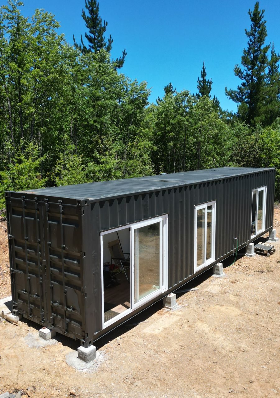 La casa container está sobre 15 bases de concreto con cadenas, posibilidad de crecer hacia arriba o hacia los costados. Tiene 30 m2 construidos, posee termopaneles blancos en todas sus ventanas ,cocina, baño con showerdoor, calefont con balon de gas.
